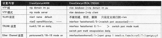 在划分中,VLANI为所有交换机的管理VLAN1,并将其分配保留IP地址,可以仅在内部管理;对于规模大的部门,如物理系,分别将其行政办公、网络服务器、利用多媒体教学软件的教学机房置于不同的VLAN。在IP子网的分配中,充分利用可变子网掩码(VLSM)。可以根据各VLAN中节点的数目高效利用IP地址,减少浪费。VLAN在CiscoCatalyst 4006和Cisco Catalyst 3524/2924XL上具体实现方法如表2所示。 ![]() 利用VTP DOMAIN、Trunk、Ether Channel的具实施 在创建VLAN之前,必须规划和创建VTP Domain。在VTPDomain中,仅在一个交换机中对VLAN进行管理,如增加、删除、调整的设置,VTP(VLAN Trunking Protocol)会通过网络自动地将信息向其他交换机广播,来保持这个域内交换机VLAN配置的统一性。由于目前我校设备中只有中心的4006交换机具有路由能力,且校内有属于同一部门、但地理位置不同即VLAN跨接的情况,因此确定将整个校园网规划为一个VTPDomain,这样仅在一处就可以管理全校的VLAN,且可以利用4006交换机的MSFC模块来实现VLAN之间的路由。实际配置中,所有交换机的VTP Domain都设置im pu,将4006交换机VTP模式设置为VTP模式设置为Client,接受4006中设置的VLAN信息。 为使VLAN信息在网络中传递,交换机之间的连接端口要配置为Trunk。这样,在VTPServer交换机中配置的VLAN信息会通过Trunk端口发布到其他交换机。处于VTPClient模式的交换机也可以通过Trunk端口向下级级联的交换机继续传递,达到VLAN信息的统一。Cisco交换机支持两种Trunk封装类型,即ISL和802.1Q,802.1Q所做的标记要比TSL的小,开销相对低,因此我们采用了802.1Q封装类型。 最后,基于上述的主干连接,在各个交换机中按照连接的用户部门,灵活地将端口分配到各个VLAN。在4006交换机的MSFC模块配置中为建立的VLAN接口分配IP地址即可。下面为在CiscoCatalyst4006和CiscoCatalyst3524/2924XL上实现的具体实例,摘录见表3。