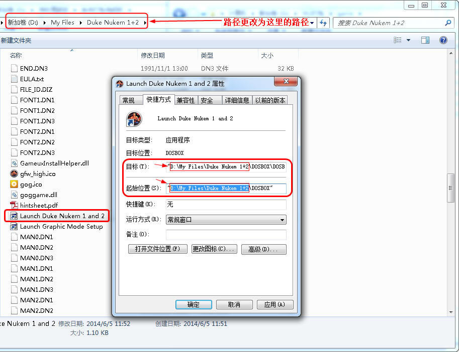 | 每一个伟大的英雄都有一个不起眼的开始。回到毁灭公爵的初始之地,你一直在呼吁一个绝密的任务,从邪恶的博士和他的机器人军队中拯救世界!毁灭公爵将带你穿过被毁灭的城市、秘密的月球基地、和未来的地球,你有勇气踏进这个毁灭公爵的世界吗? 【游戏介绍】3D Realms出品的90年代经典游戏毁灭公爵1和毁灭公爵2的合集,GOG版本,免DRM。 【基本操作】移动:左右方向键 【游戏配置】操作系统:Windows XP/Vista/7/8 【进入说明】游戏使用的是DOS模拟器,不会用的玩家可能在启动游戏时会提示路径错误,玩家可以自己对路径进行修改来正常启动游戏。 找到游戏目录下的“Launch Duke Nukem 1 and 2”然后鼠标右键选择属性,将“目标”以及“起始位置”的路径更改为对应的目录路径即可。