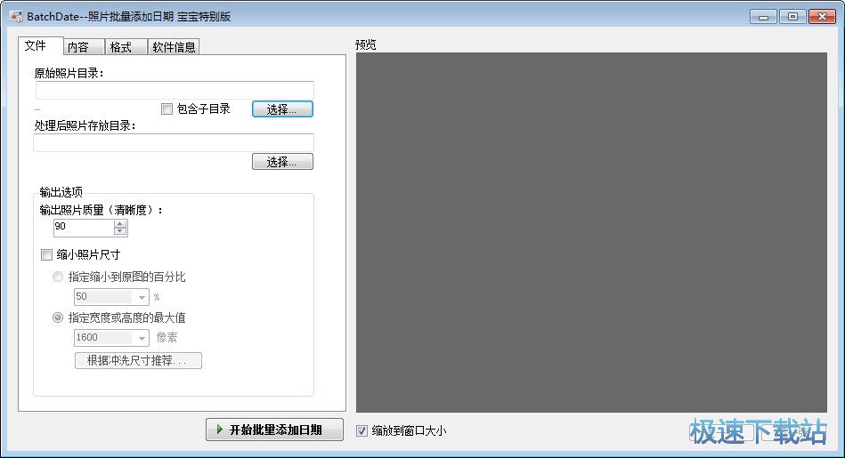 使用说明 模板中的{拍摄时间}将会被替换成实际的照片拍摄时间。 当需要在照片上显示宝宝的年龄时,可以在模板中插入”{宝宝年龄}“文字,并在此处设定宝宝的出生时间,以及年龄的显示格式。 使用方法 1、打开软件,在原始照片目录中选择您图片保存的文件夹,单击打开即可 2、选择处理以后照片保存的位置 3、设置照片的输出质量,可以随意选择、可以缩小照片的尺寸 4、点击开始批量添加日期,能够将整个文件夹中的图片全部添加时间