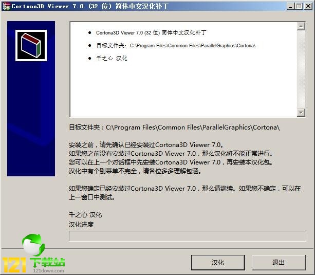 图形(Graph)和图像(Image)都是多媒体系统中的可视元素,虽然它们很难区分,但确实不是一回事。图形是矢量图(Vector Drawn),它是根据几何特性来绘制的。图形的元素是一些点、直线、弧线等。图像是位图(Bitmap),它所包含的信息是用像素来度量的。 Cortona3D Viewer是一款好用的3D文件浏览器,与其它文件不同的是,该软件支持在浏览器、office软件中查看相应的3D文件,并且支持多种渲染模式供用户选择,同时还提供了高级渲染功能,小编提供的Cortona3D Viewer汉化实丁仅支持7.0版本,安装后软件的界面就会变成中文了。 Cortona3D Viewer汉化补丁使用说明1、首先安装主程序,接着在本站下载汉化补丁解压 2、双击“C3DV7_chn.exe”进入安装向导