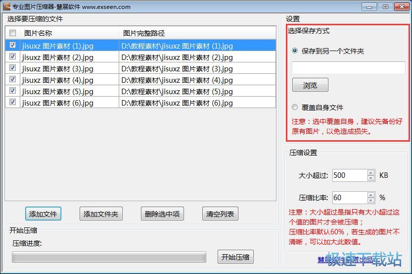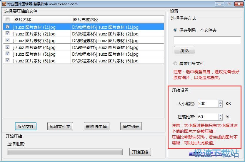 注意:大小超过是指只有大小超过这个值的图片才会被压缩;压缩比率默认60?若生成的图片不清晰,可以加大此数值。 5、设置好以后点击开始压缩即可。
