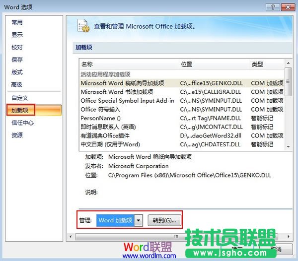 ③切换到加载项标签,在管理中选择Word加载项,单击转到。
