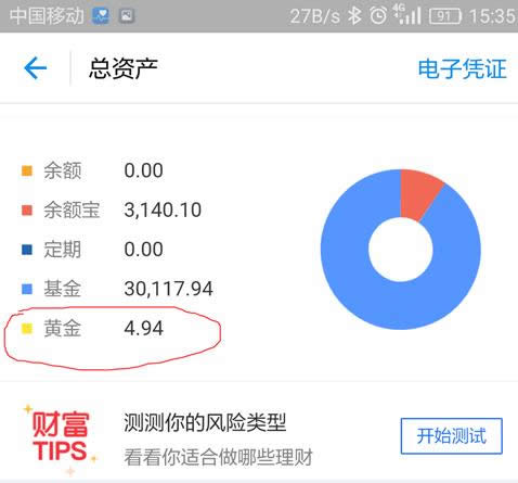 支付宝抽黄金 支付宝抽到黄金提现方法 无论是在官方还是网上,小编都没有找到相关方法,于是只能自己摸索,然后发现了一条道道: 前提条件是你需要抽中黄金,不然有可能看不到入口,首先打开支付宝,依次点击我的——总资产,可以看到在总资产这一栏有“黄金”这一个选项 虽然这里看到的是0.00,不过这是收益的一栏,显示的不是资产,支付宝不会坑大家的请放心,然后点进去,就能看到自己抽到了多少黄金了,并且还有相应的选项可以操作,