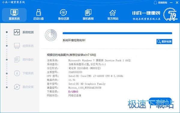 主要功能 云端匹配,高速下载,无需技术,傻瓜式一键在线重装 功能介绍 一键操作 高速下载 人性化设计 多元化选择 智能化选择系统 使用方法 一、下载小兵一键重装系统软件,然后打开软件小兵一键重装系统会检测您的电脑信息。如下图: