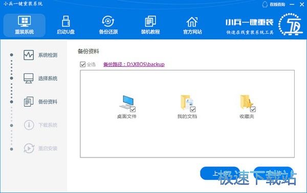 说明: 系统分为三个版本 1、装机版系统= 集成常用软件+万能驱动+系统补丁 (无商业软件) (默认 适合新手) 2、纯净版系统= 只集成万能驱动+系统补丁(无商业软件) 3、MSDN原始版= 微软原版系统=未集成万能驱动+系统补丁+常用软件 三、点击“下一步“,进入资料备份界面,通过勾选可以选择对“我的文档”、“收藏夹”、“桌面文件”进行备份,备份资料会保存到自动生成的本地比较大的分区“X:\XBOS\BACKUP”目录内,此目录会根据电脑磁盘中比较大剩余空间容量作为文件、系统的备份以及下载的系统自动产生。如下图所示: