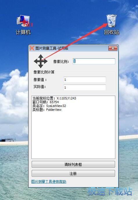第一次打开软件,点比较下方的左边一个按钮试用一个月,然后就可以试用了。 鼠标左键按下 不要松开,移动鼠标到目标位置松开,标下第一个点。再用鼠标左键 不要松开,移动鼠标到目标位置松开,标下第二个点,这时在下方的列表框计算出两点的像素,将实际尺寸输入实际值对应的文本框,将像素距离输入像素值对应的文本框,即可生成像素比例。 确定了像素比例,再按上述方法标定需要测量的点,即可在下方的列表框得到实际距离值。 作用,即列表框满了,点击该按钮,列表框的数据清空,标定的点又从1开始,当然,如果像素比例已标定好,这时还是有效的。 使用方法 运行软件后鼠标左键按住软件左上方的按图,拖动鼠标到一个位置,然后释放鼠标。