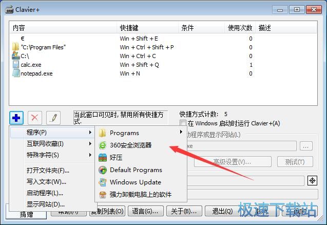 Clavier简直就是法语中的键盘。 请注意这个名称令人难以置信的原创性,以及为找到它而展开的创造力! 主要功能 推出一个程序:Microsoft Word,计算器,Internet浏览器等。 使用方法 1、下载并解压,双击 [Clavier.exe] 打开软件,点击左边的蓝色“+”号,选择程序,再选择一个应用程序(例如:360安全浏览器)。