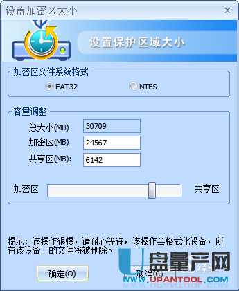 调整容量之后单击“确定”。(提示:创建加密分区会格式化U盘所有数据将被删除,需提前备份好)