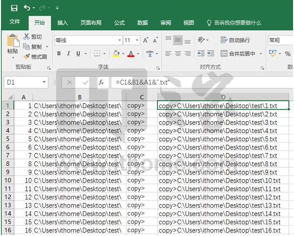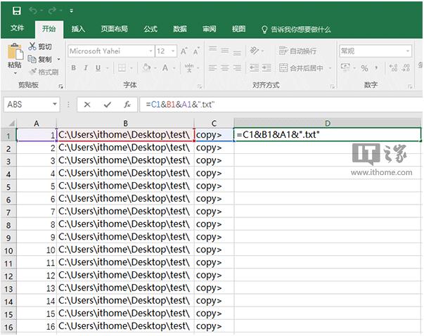 3、在B列输入你要创建文件或文件夹的位置(在B1中输入后,直接在该单元格右下角拖拽到需要的行即可完成批量录入),例如下图中桌面文件夹test的位置为: C:\Users\ithome\Desktop\test\