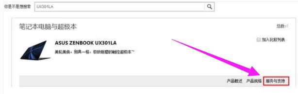 触控板驱动载图1 也可以在输入产品型号以后,点击搜索框右侧的点击进行搜索,在搜寻结果列表中找到您的产品型号,然后点击下方的“服务与支持”进入驱动下载页面