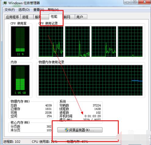 电脑慢载图5 选择上面的性能选项,点击“资源监视器”