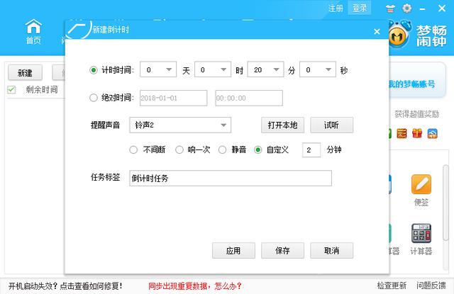 电脑闹钟载图4 【闹钟提醒】 点击闹钟提醒,点击‘新建’,根据自己的需要,在弹窗中设置好相应的数字,点击应用即可,我觉得此功能的特色在于它可以设置循环周期,提醒铃声可以自定义。非常人性化的设定