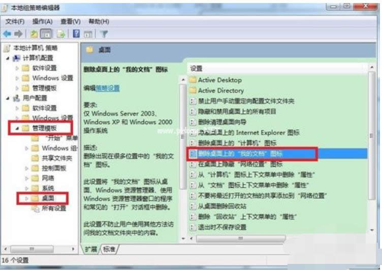 win7载图1 2,选择“用户配置”--“管理模板”--“桌面”,在右侧相应的条目中选择图示条目,并双击。