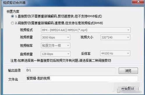 截取载图4 在弹出的新窗口中我们选择“直接剪切”一项,然后下面设置好输出目录与文件名,最后点击开始剪切按钮就可以了。