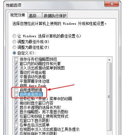 恢复程序载图4 进入“设置”,找到“视觉效果”的“玻璃效果”和“启用桌面组合”取消这两个显示效果: