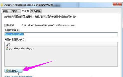 删除文件载图2 切换到“所有者”选项卡。 一般情况下默认所有者为TrustedInstaller(没有影响),单击“编辑”按钮。