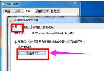 错误代码载图10 在 WMI文件夹高级属性页面,选择权限--继续