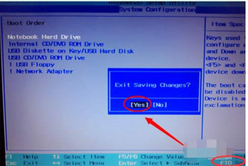 惠普载图4 如果设置好之后,选择按下F10键盘。保存并退出BIOS设置(选项 YES)