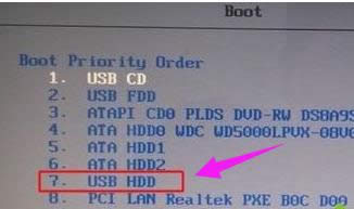 笔记本载图1 在要重装系统的电脑上插入U盘,启动时按F12等按键,选择usb hdd启动,无法使用快捷键,则进入BIOS设置U盘启动
