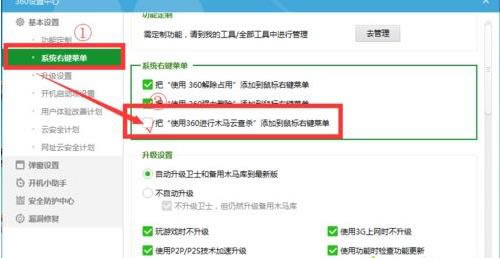 3、在设置选项中,把“使用360···添加到鼠标右键菜单”√上,一般是在设置第三个,如果一开始找不到这个选项,可以点击左边的“系统右键菜单”找到;