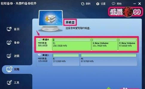 第三步:把旧硬盘中的资料转移到新硬盘中。 我们以克隆磁盘0到磁盘1为例来说明磁盘克隆的操作方法: 左键双击启动系统桌面的轻松备份程序,在打开的轻松备份专业版窗口的左侧点击:克隆,在克隆对应的右侧窗口点击:磁盘克隆 - 克隆一个磁盘到另一个磁盘;