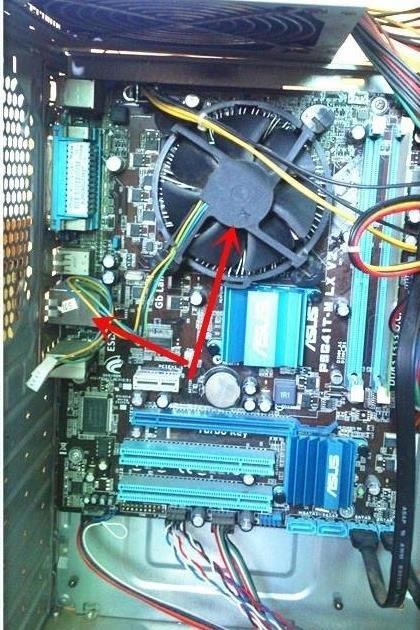 3、打开主机箱之后,向同一方向(左边)旋动散热器(也就是小电扇)旁边的几个固定螺丝(一般是左松右紧),然后用力就可以取下小电扇。取下小电扇的线子。