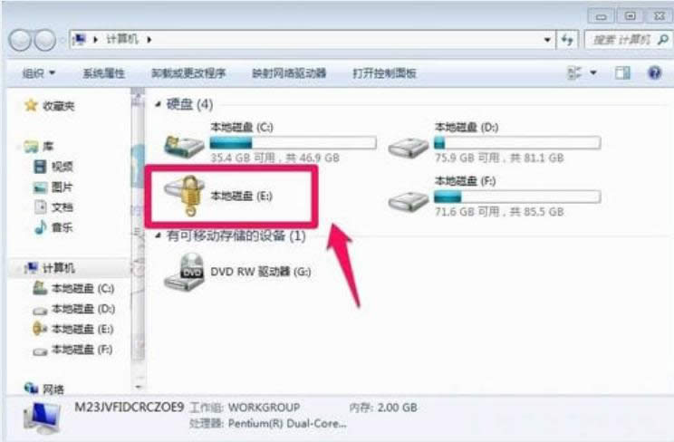 Windows 7,中文名称视窗7,是由微软公司(Microsoft)开发的操作系统,内核版本号为Windows NT 6.1。Windows 7可供家庭及商业工作环境:笔记本电脑 、平板电脑 、多媒体中心等使用。和同为NT6成员的Windows Vista一脉相承,Windows 7继承了包括Aero风格等多项功能,并且在此基础上增添了些许功能。 为了我们电脑的安全,我们时常会需要对硬盘中的一个磁盘进行加密,因为这样一来别人就将看不到我们的文件了,那么小伙伴你们知道该怎么给硬盘加密码吗?不知道的话,那么就随小编一块来看看给硬盘加密的方法吧。 小伙伴们,小编今天来给你们一个非常劲爆的技能,那就是给硬盘加密的方法。你们听完过后有没有心跳加快呢?有的话,那么你们想不想和想一块去看看呢?想的话,那么事不宜迟,这就去看看吧。 1、打开电脑的计算机,然后我们找到想要加密的磁盘!如图所示: