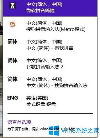 Windows 8是美国微软开发的新一代操作系统,Windows 8共有4个发行版本,分别面向不同用户和设备。于2012年10月26日发布。微软在Windows 8操作系统上对界面做了相当大的调整。取消了经典主题以及Windows 7和Vista的Aero效果,加入了ModernUI,和Windows传统界面并存。同时Windows徽标大幅简化,以反映新的Modern UI风格。前身旗形标志转化成梯形。 很多用户用上Win8系统后,对切换输入法的操作的不太熟悉,其实Win8切换输入法的方法与此前系统的操作方法大同小异,有一些细微的变化。下面小编为大家介绍Win8系统下切换输入法的两个快捷方法。 一、使用Win键+空格键组合 当用户将鼠标移至右下角输入法图标处时,会在输入法图标上方提示用户,可以按Windows键 空格键来切换输入法。操作时,用户可以先按住Win键,然后按一下空格键,这时会在界面右侧弹出输入法选择界面,并且已经切换了一次输入法选项。在用户一直按住Win键时,每按一次空格键,输入法选项就会切换一次,直到切换至用户需要的输入法,再松开Win键,即可使用需要的输入法打字。