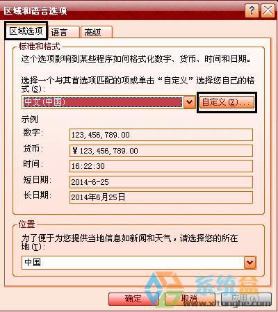 3.切换到“区域选项”选项卡,点击“自定义”按钮