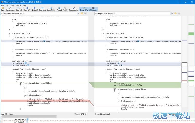 软件特征 -改进XML和C风格源代码的扩散质量 -所有差异的缩略图视图 -更改、删除和添加行之间的区别 -突出显示-双击或搜索一个单词来显示它的所有实例 语法高亮显示 -支持Unicode和自动检测编码(并警告如果编码不匹配) -可定制接口 在您的类型中在线更新 - Windows资源管理器外壳集成 -便携式(可以直接从外部设备运行) 更新日志 如果文件是相同的,则在弹出文件之前使用二进制检查添加弹出窗口 拇指视图外观调整和查看指示器颜色可以在首选项中设置 语法着色大修: 统一所有语言的所有颜色,以使用相同的托盘,更好地处理深色主题,也使得它们更加友好。 删除所有突出显示,导致粗体或更改背景以避免与差异变化混淆 增加了对CLE、JSON、Python、R、rpgLE、TSQL的支持,以及对现有的一些支持 启用默认语法高亮显示 添加到最后一个/第一个差异和下一个/PRV匹配 添加的IF实例突出显示设置应在双击或选择更改时突出显示 向Debug中添加错误报告,弹出关于如何报告崩溃的信息 如果文本文件没有加载文件并且没有文本,则即使它被触摸也不脏。 在上下文菜单中向左/右添加副本 因此可以将文本设置为粗体 如果只有左侧编辑器有一个文件打开,默认为左键处理键盘输入 在不关注的情况下关闭ESC偏好 固定水平滚动轴忽略空文本编辑器和完全折叠编辑器 打开文件对话框 次优化 修正错误:如果被另一个.inity实例锁定,设置有时不会被加载,例如当diffing>20个文件同时被锁定时 修正错误:ReDIFF在保存时完成两次,如果左文件和右文件都改变了 修正错误:当点击L/R时,实例的亮点被搞乱了 修正错误:水平滚动条和活编辑的编辑是不正确的,直到ReDIFF在缩进了细线之后才被按下。 修正错误:清除路径/点击新的空差异导致滚动条不正确更新 修正错误:当输入文本和移动分割器时,在水平滚动中固定崩溃。 修正错误:在关闭语法高亮标签并再次打开首选项后,“固定偏好”对话框为“空白”对话框。 修正错误:固定崩溃和分散问题,选择一个文本和删除/替换它 修正错误:在第一个或最后一列中的实例突出显示在拇指视图中 修正错误:如果整个文本足够短,则实例突出显示得太宽了。 修正错误:使用VisualStudio对外编辑打开的文件并没有显示在磁盘对话框上更改的文件 修正错误:如果在最后一行并按F5,文本滚动到一行。 文件信息 文件大小:409936 字节 文件说明:Diffinity setup 文件版本:0.8.8.0 MD5:B4BA0E57F2816FB1DD179E17C048957C SHA1:988387352FFBF5424CE33D4831FA1A5AE87177C5 CRC32:AFD851CB 官方网站:http://www.truehumandesign.se/s_diffinity.php 相关搜索:比较 对比