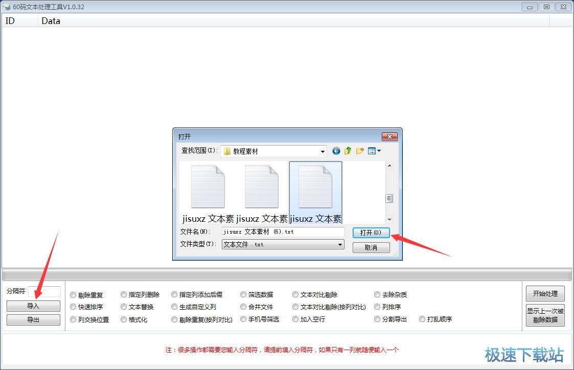 功能介绍 剔除重复、指定列删除、指定列添加后缀、筛选数据、文本对比剔除、去除杂质 使用方法 1、下载并解压,双击 [60码文本处理工具.exe] 打开软件,点击左下方的导入按钮,选择一个要处理的TXT文本文档,点击打开。